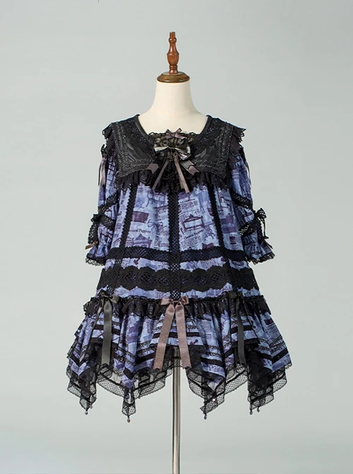 Classic furniture print babydoll skirt, mid-sleeves, lace cutout dress hem, layered pleated hem, delicate and cute.