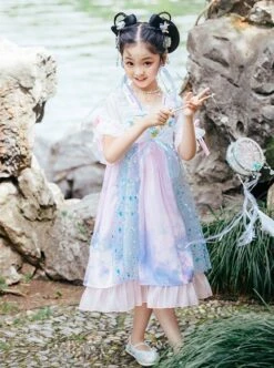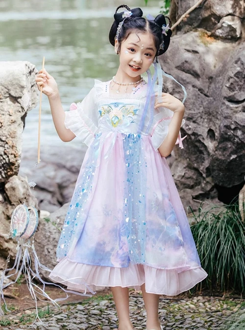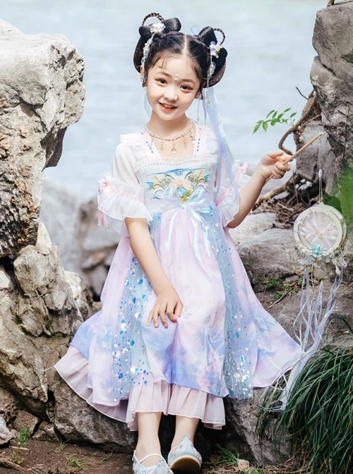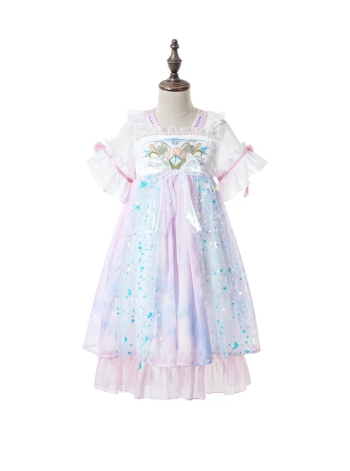 Embroidered bow detailing the front and tiered skirt. Comfort fabric with ink sequins.
