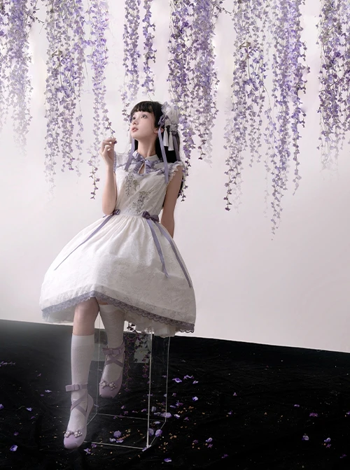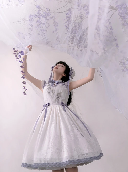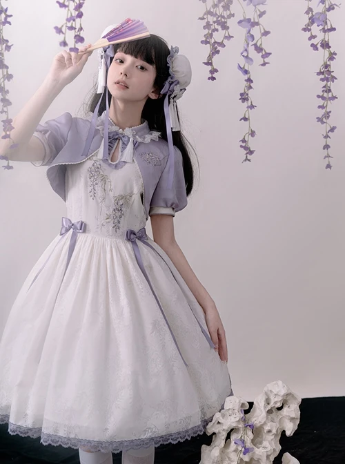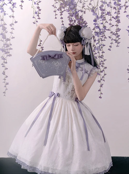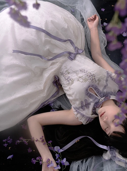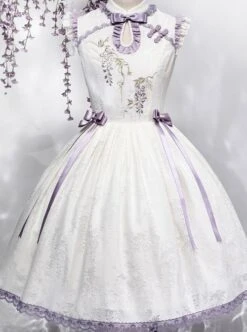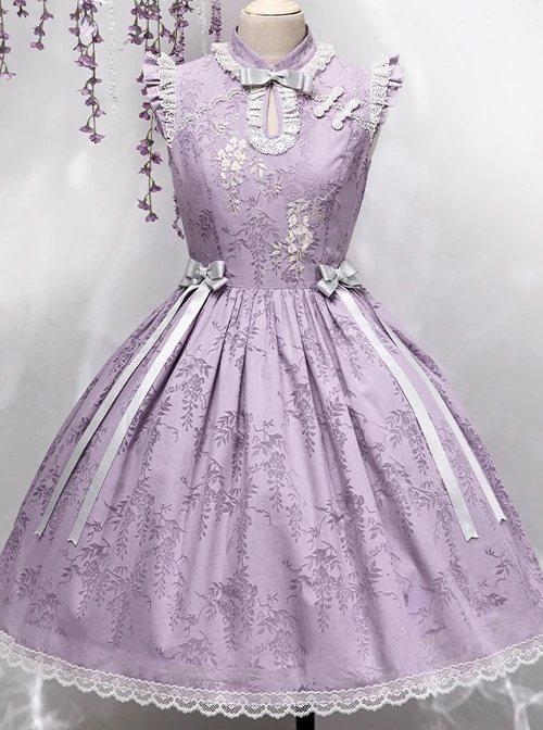 Custom wisteria roasted flower dark pattern fabric, Chinese style stand collar design, wisteria flower embroidery print, and bowknot decorate the elegant sleeveless dress.
