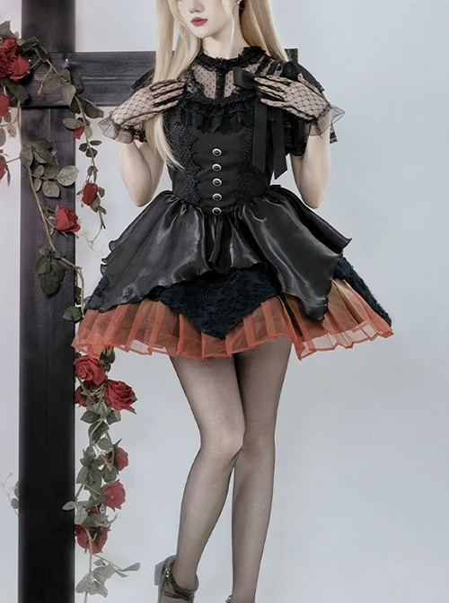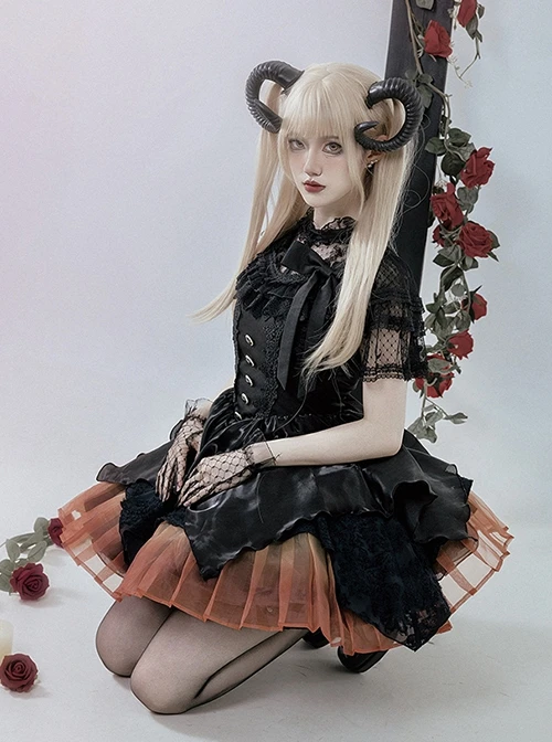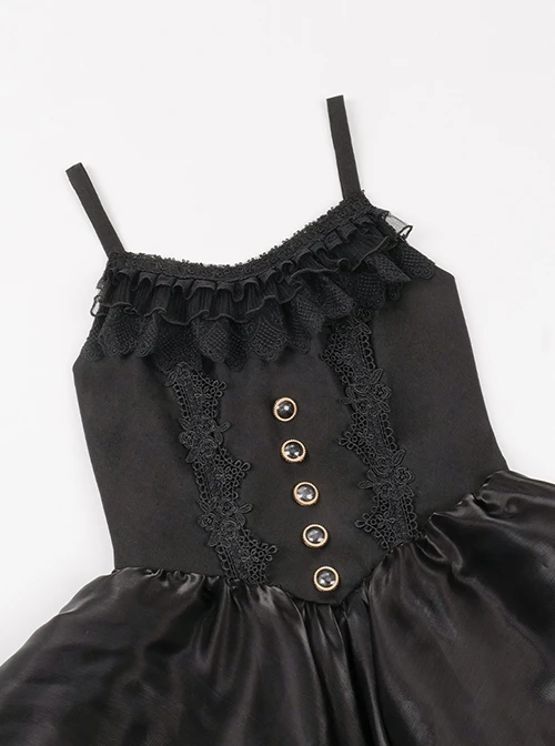 This dress is in Gothic Lolita style, mainly black, with smocked lace at the neckline, three different lace styles, and built-in fishbone waistbands on both sides of the waist.