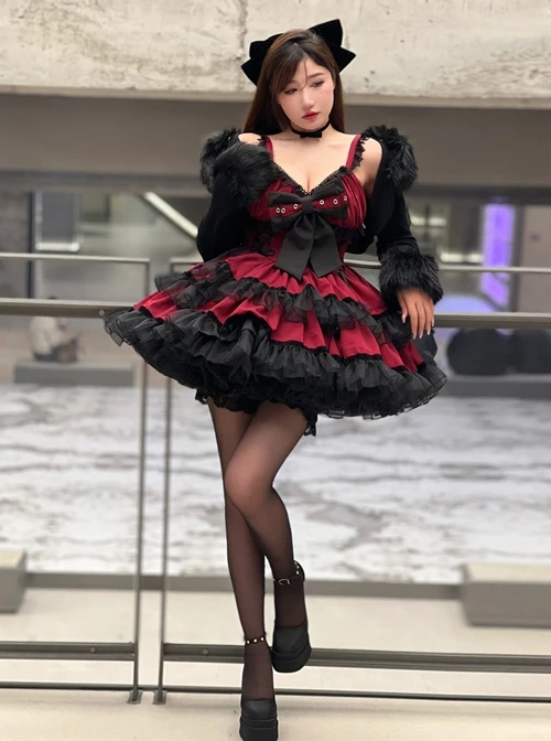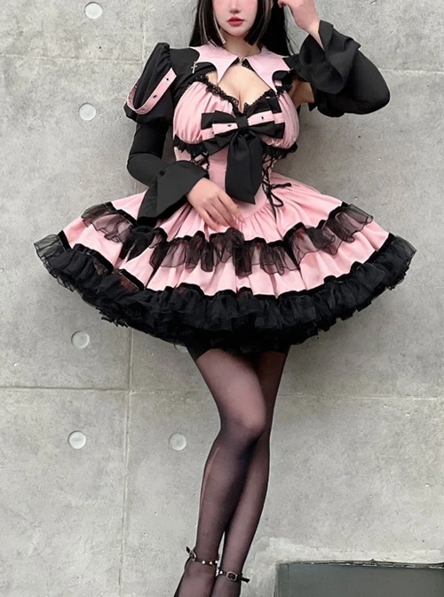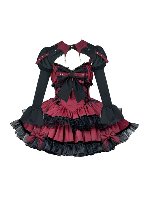 Lace bowknot decoration, Bat wing collar cross design, puff sleeves, sweet and sexy