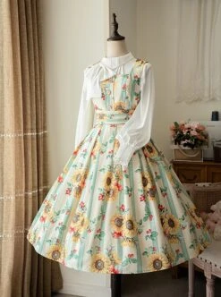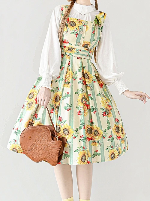 Elegant and classic sundress style, suitable for daily use and cute. The sunflower print is lively and cute, and the striped background decoration enriches the details.