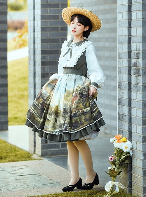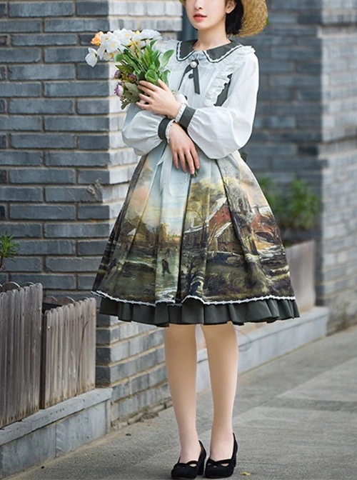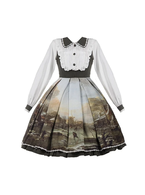 The print of the dress is a pastoral oil painting, very retro and beautiful, highlighting the snowy scene at sunset. The skirt has a doll collar and ruffle design, and the colors are harmonious and rich.