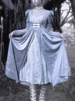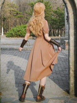 Vintage Mid-Century Coral Striped Gothic High Waist V-Neck Puff Short Sleeve Long Dress