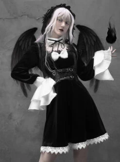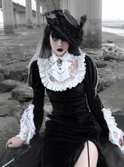 White Lace Black Velour Gothic Long Sleeve Lantern Sleeve Bowknot Dress