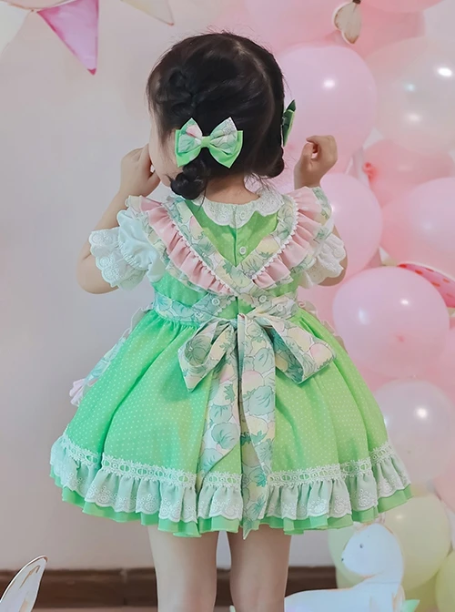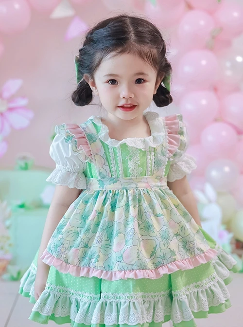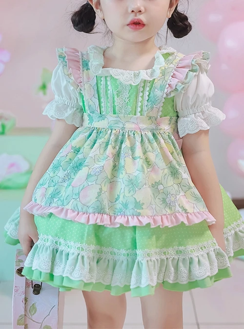 Cute lace collar design, strawberry printed apron, green polka dot fresh short-sleeved dress