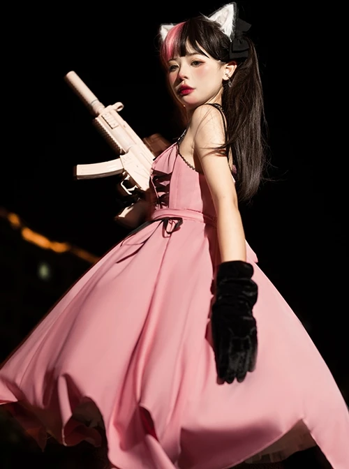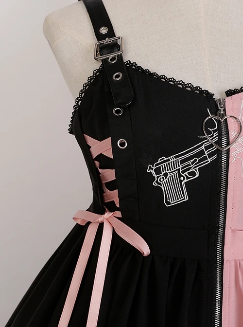 Black and pink contrast, guns and roses embroidery, front zip fastening, ribbon decoration, irregular hem design