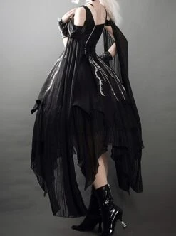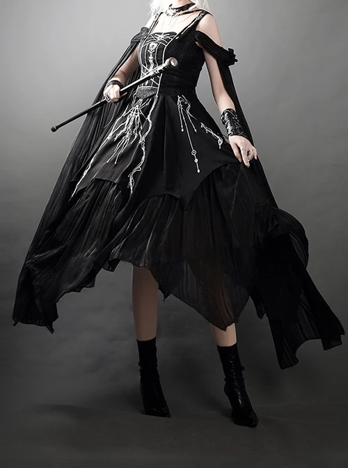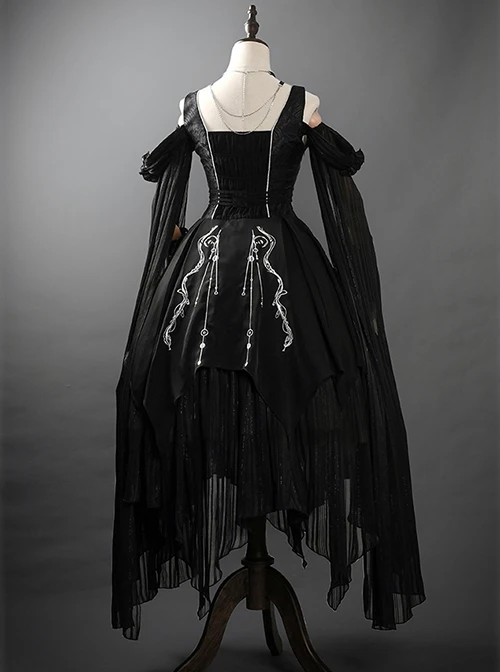 The dark gothic Lolita suit includes a sleeveless high-waisted dress, a pair of sleeves and wristbands, and an exquisite necklace. The dress is an A-line shape with a fluffy and irregular hem. The skirt has silver mysterious embroidery.