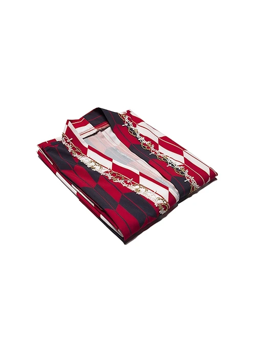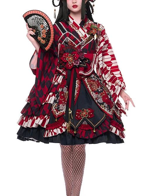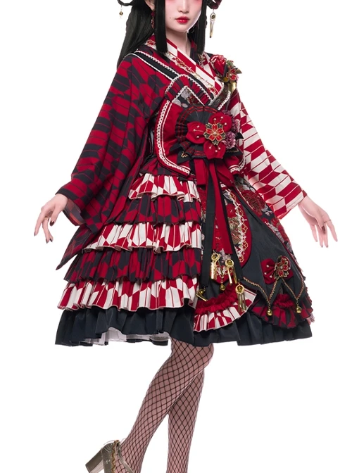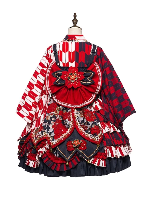With contrasting colors of black, red, and gold, the Japanese style is gorgeous and elegant. Details include pearl and gold thread embroidered cherry blossoms, removable bells, and gold thread jacquard fabric.