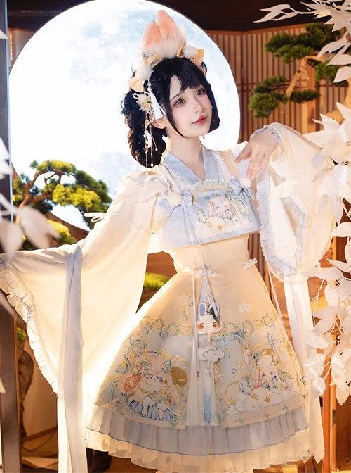 U-shaped neckline design, cute bowknot and plush pom on the shoulders, flexible and elegant ruffled skirt design, high waist, and slim fit with cute rabbit print dress set