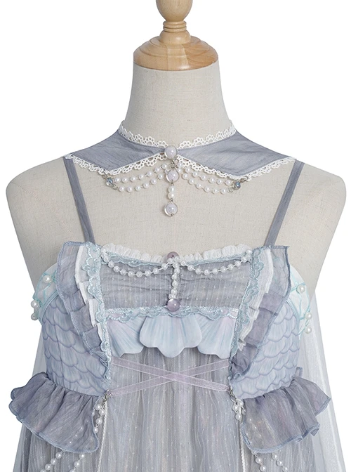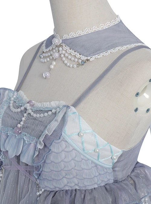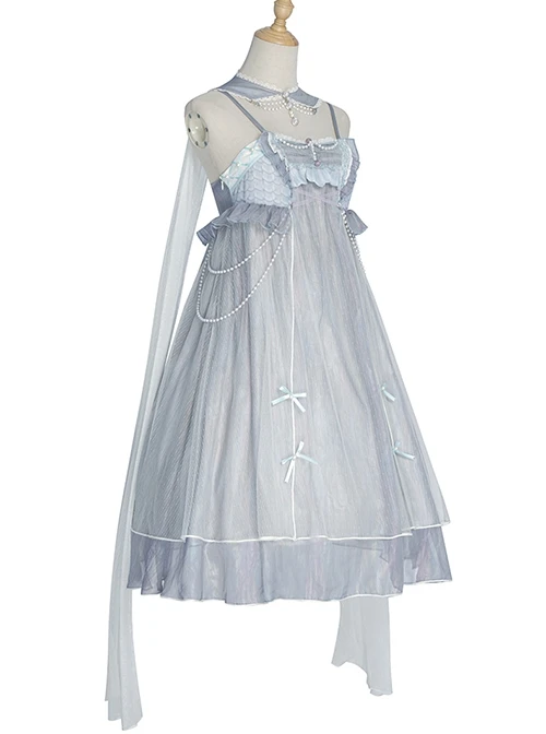 Fish scale pattern printing, three-dimensional fishtail shape on the chest, pearl chain decoration, bowknot on the skirt, elegant and elegant.