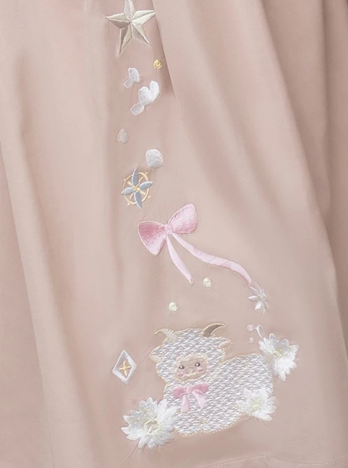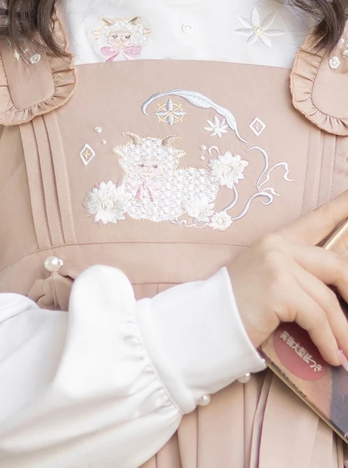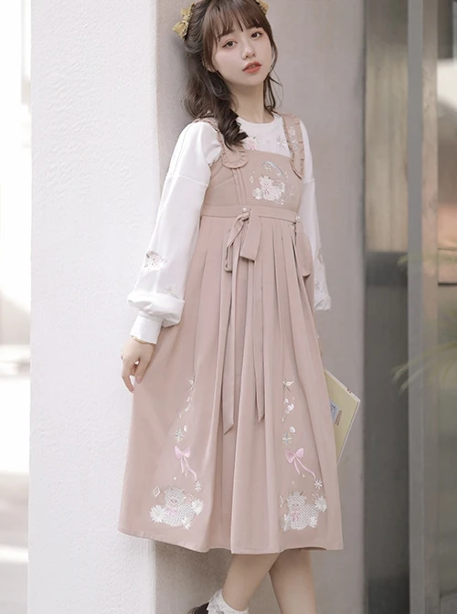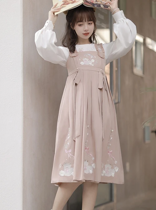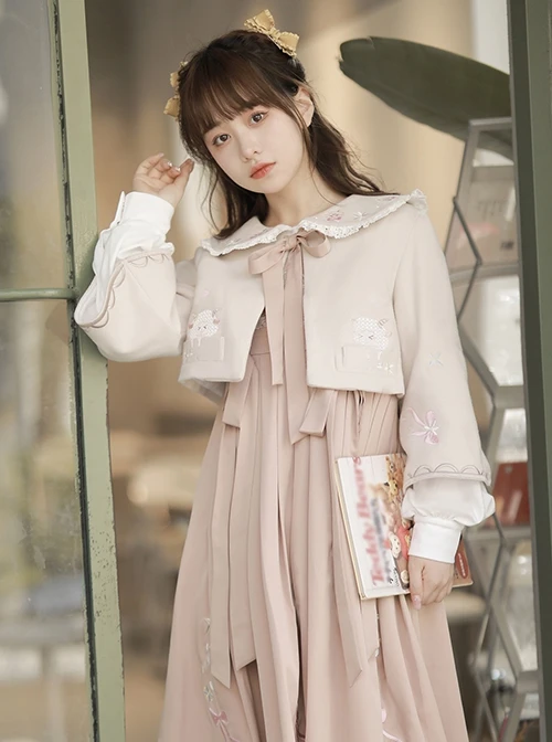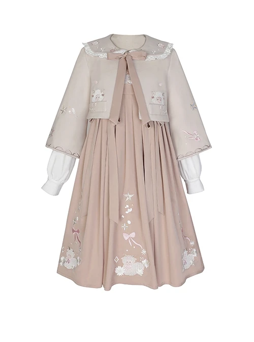 Pink doll collar coat, lace neckline, pink bow suspender dress, pleated waist design, exquisite embroidery on the hem, lantern sleeve top, three-dimensional and stylish.