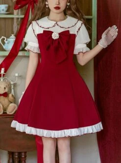 Doll Collar Chest Red Big Bow Puff Sleeves Ruffled Hem Design Classic Lolita Short Sleeve Dress