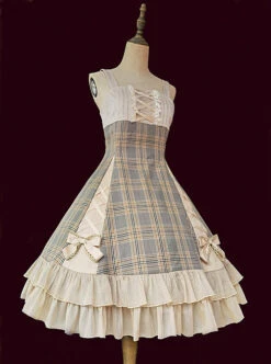 Bear Cookies Series OP Brown Pleated Plaid Bowknot Classic Lolita Long Sleeve Dress