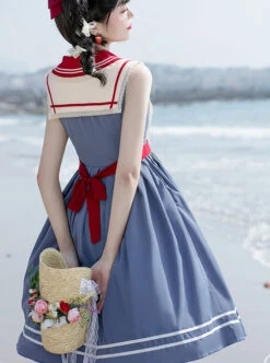 College Uniform Style Sailor Collar Navy Blue Stripes School Lolita Long Sleeve Dress
