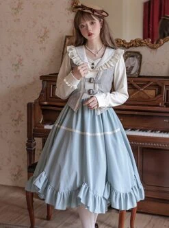 Vintage Elegant Lace V Neck False Three Pieces Petal Hem Design Classic Lolita Long Sleeve Dress