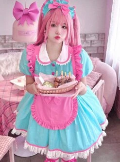 Vintage Playful Maid Coffee Cute Lace Doll Collar Pink Bowknot Apron Sweet Lolita Short Sleeve Dress
