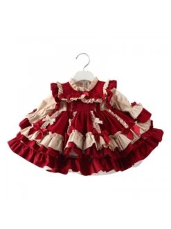 Autumn Winter Bowknot Ruffle Delicate Children Sweet Lolita Kids Wine Red Long Sleeve Dress