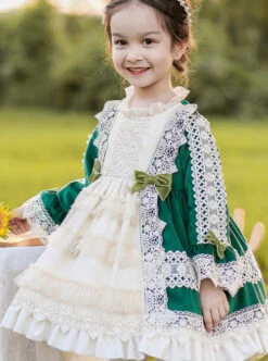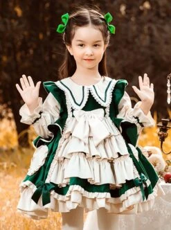 Autumn Winter Velvet Bowknot Lace Decoration Princess Dress Classic Lolita Kids Long-Sleeved Dress