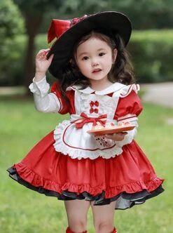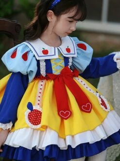 Autumn Round Neck Lace Bow-Knot Decorate Pizza Embroidery Classic Lolita Kids Long Sleeve Dress
