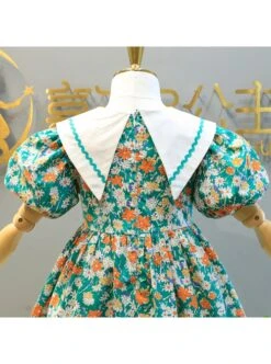 Color Floral Decoration White Triangular Lapel Design Cotton Classic Lolita Kid Short Sleeve Dress
