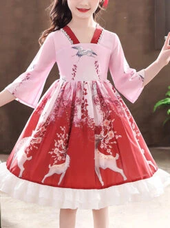 Elegant Chinese Style Classical Printing Children Classic Lolita Kids Half Sleeve Dress