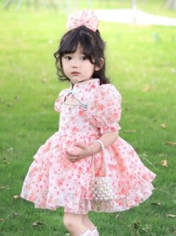 Floral Stand Collar Hollow Design Puff Sleeves Pink Sweet Lolita Kids Short-Sleeved Dress