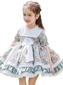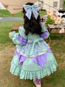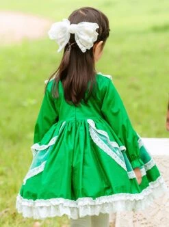 Green Fresh Spring Autumn Flower Lace Square Neck Classic Lolita Kids Long-Sleeved Dress