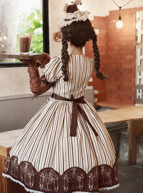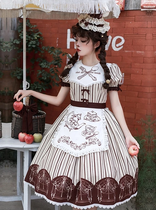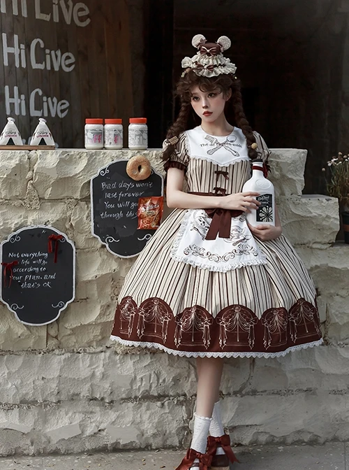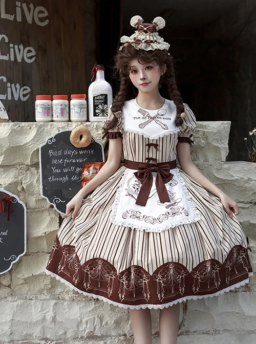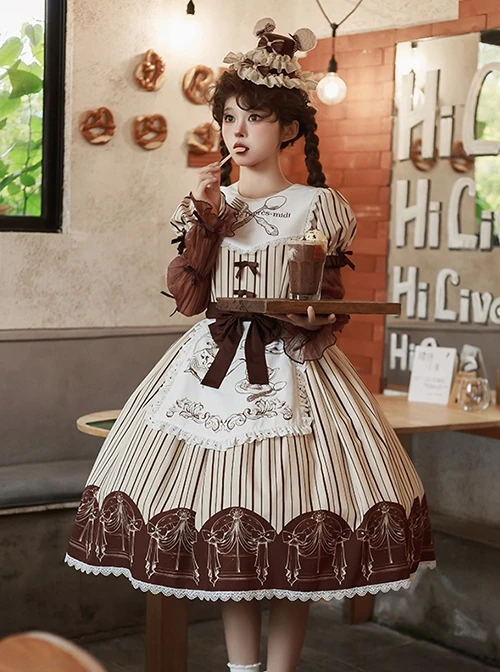 The neckline embroidery is cute and well-behaved, the original brown fork and spoon embroidery is delicate and exquisite, the detachable apron, the original positioning tiramisu afternoon tea print fit the theme elegantly, the contrasting colors add layering to the skirt, and the matching sleeves are retro and elegant.