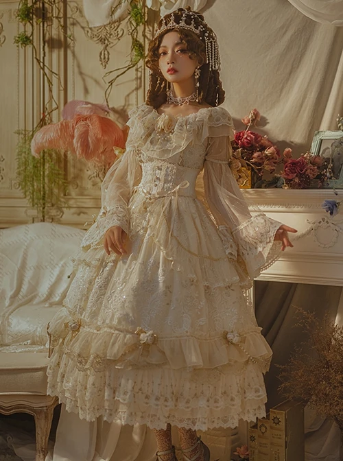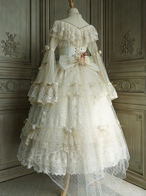 A gorgeous apricot-colored palace-style dress, covered with silver sequins and creamy white rice bead embroidery. The neckline uses two layers of gauze, there is a big bow and four small bows on the sleeves, the hem is embellished with eight bows, and the train is decorated with flowers. The whole set is very gorgeous.