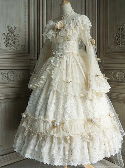 Materials: Heavy Rice Bead Sequin Embroidery, Gold Thread Embroidered Lace, Pearl Chiffon, Embossed Dark Pattern Fabric, Gelatin Fishbone