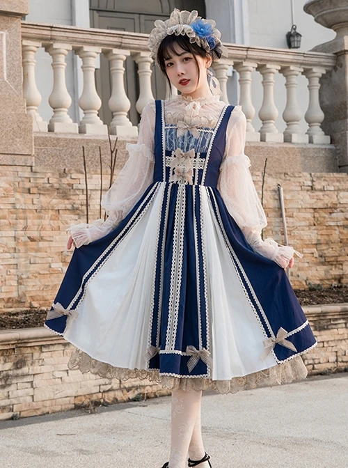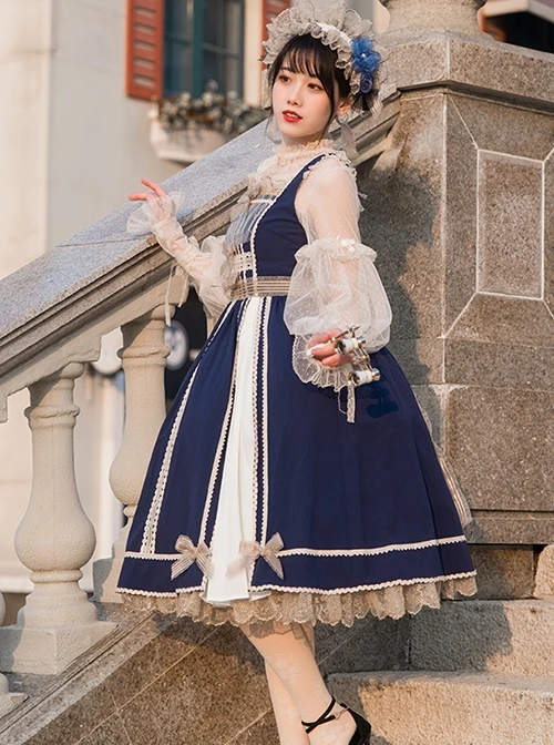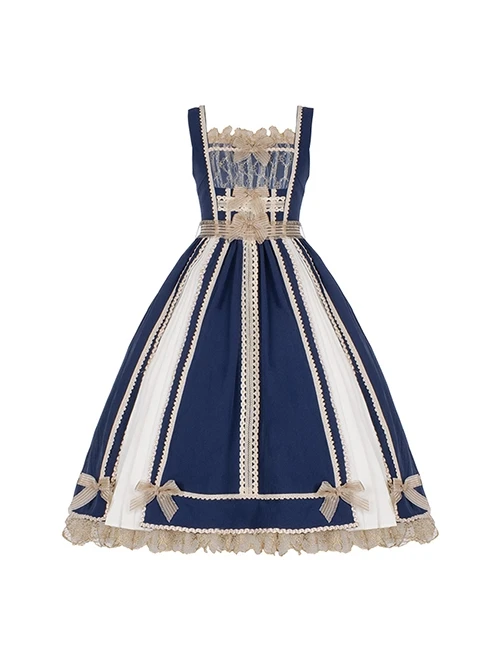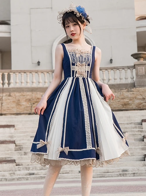 Vintage dress, has a neckline of gold lace, and cotton lace on the chest with a bow to decorate the waist, the navy blue and white color of the dress is simple and retro, the skirt is pleated and stitched with cotton lace, and the back is elastic for easy put on and put off.