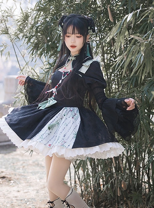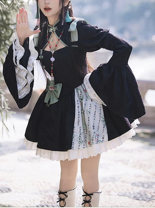 Chinese style dress, modified cheongsam elements, puff sleeves, hollow design on the chest, values made of Chinese knot elements, asymmetrical calligraphy prints on the skirt, and black and green color scheme inspired by ink and bamboo forest.