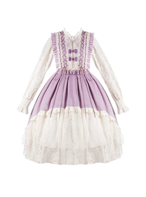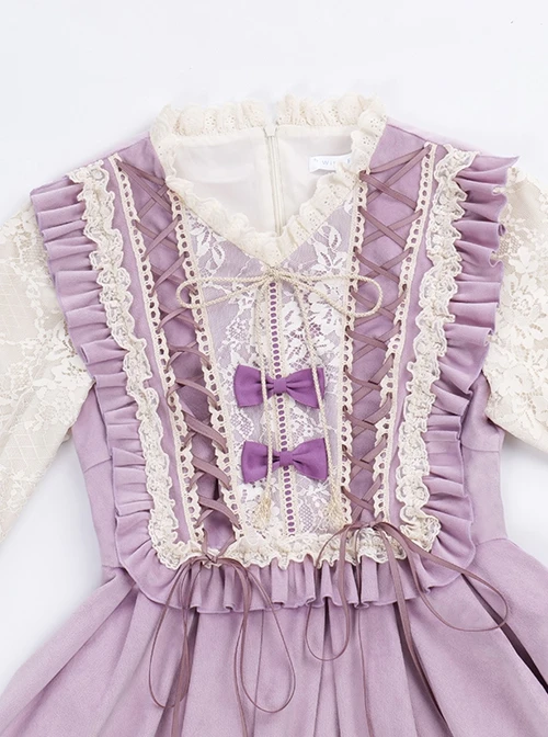Lace splice velvet design, upper body tie, lace lantern sleeves, floral lace splice irregular velvet hem, retro elegance