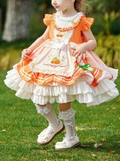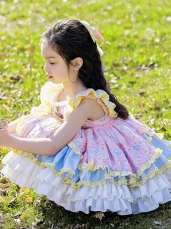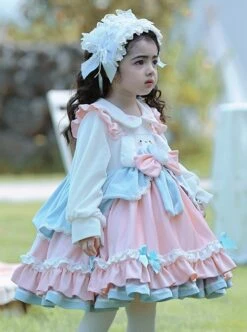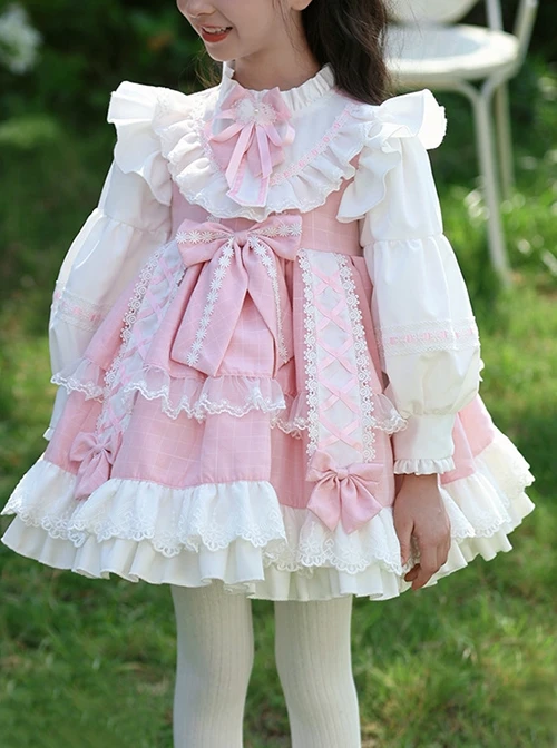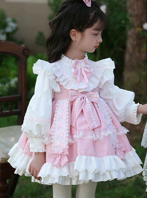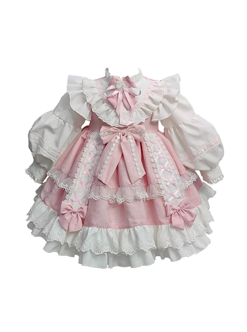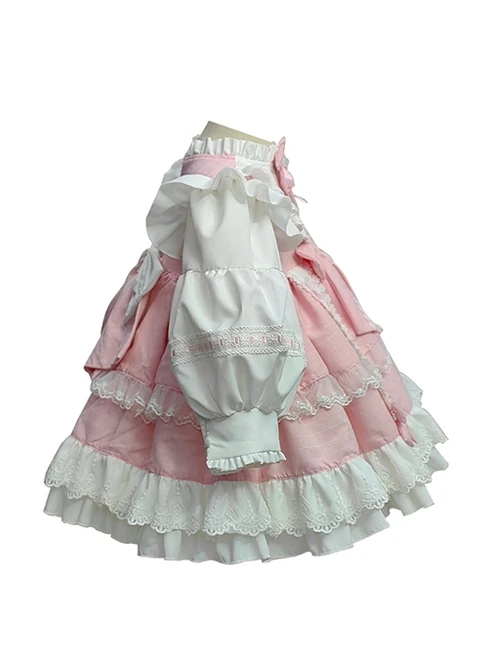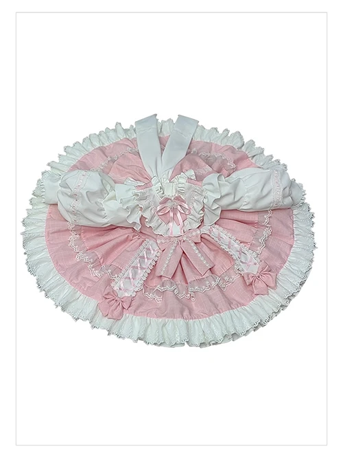 The main color of this dress is light pink, with white ruffles on the sleeves, shoulders, and hem. The pink and white combination is very sweet and cute. The sleeves of the dress are made with puff sleeves and have values on the wrists, making it easier to wear and more cute at the same time. The dress features sweet big bows at the neckline, waist, and back.Â