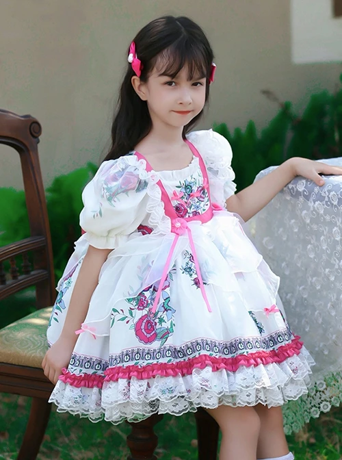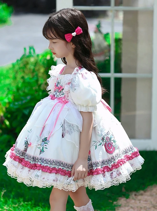 Square neck design, cute puff sleeves, white lace, high waist design, retro palace flower and grass pattern, bright pink bowknots embellishment.