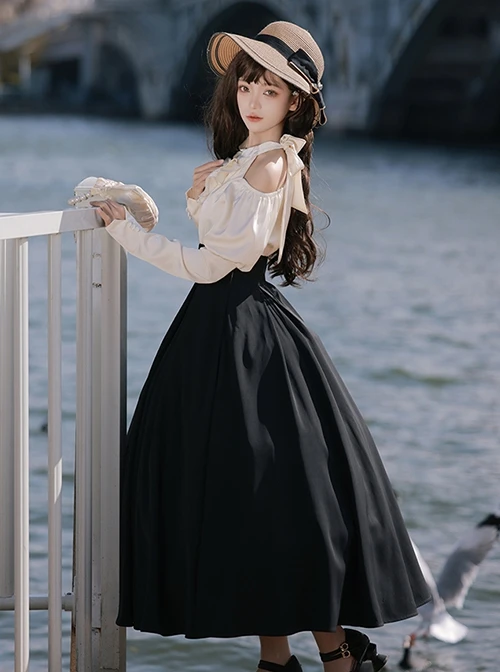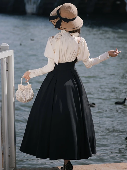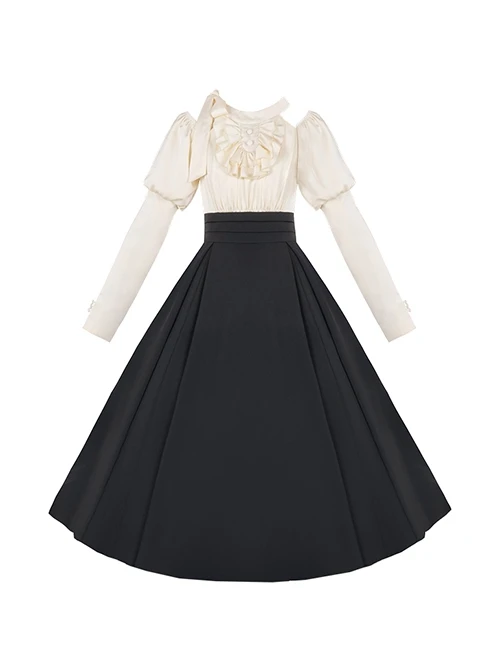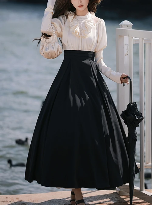 This Roman Holiday lolita long dress features a simple and elegant design that exudes a sweet and lovely atmosphere. The white Splicing Black dress is in a high-waisted A-line silhouette that flatters the figure. The delicate lace trim and bowknots add a touch of girlish romance. The high-quality fabric is comfortable and breathable.