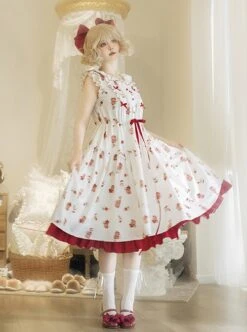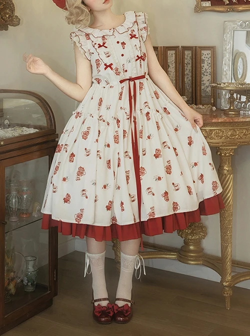 A long dress with an apricot base, embellished with a berry red tea party tableware print, cool summer ruffled small flying sleeves, a red ribbon bow at the waist, and a circle of red ruffles on the lower skirt.