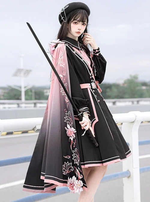 The sweet black and pink army lolita suit includes a long-sleeved dress, a one-shoulder gradient shawl, and flower epaulets. The dress comes with a pink belt, waist bag, tie, and a three-dimensional badge. The dress has a slim fit and a high waist.