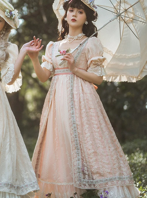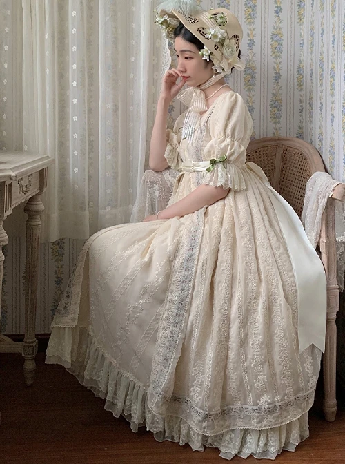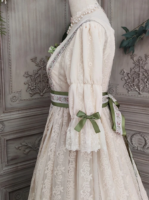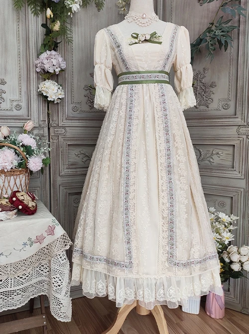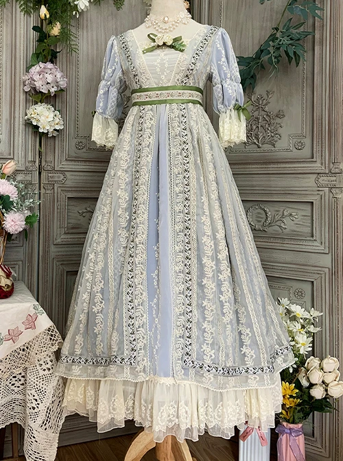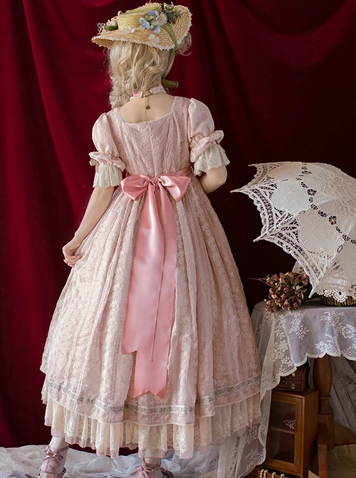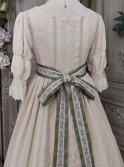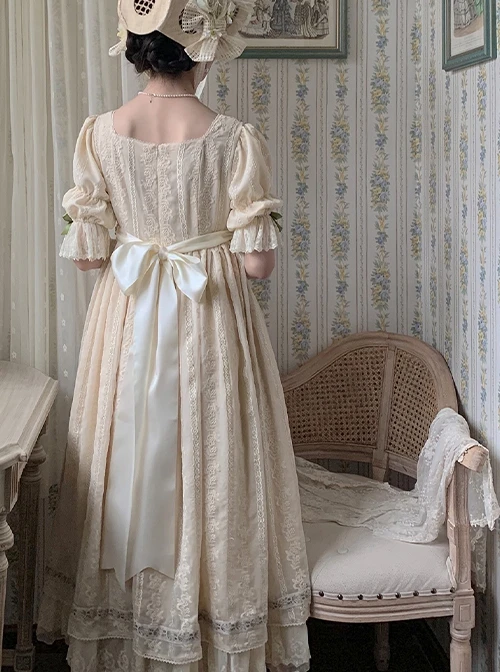 Square neck design, lotus-jointed sleeves spliced with lace, pearl satin belt, the belt can be tied into a large bow at the back, and long hem spliced with embroidered lace.