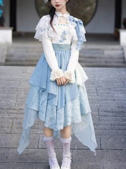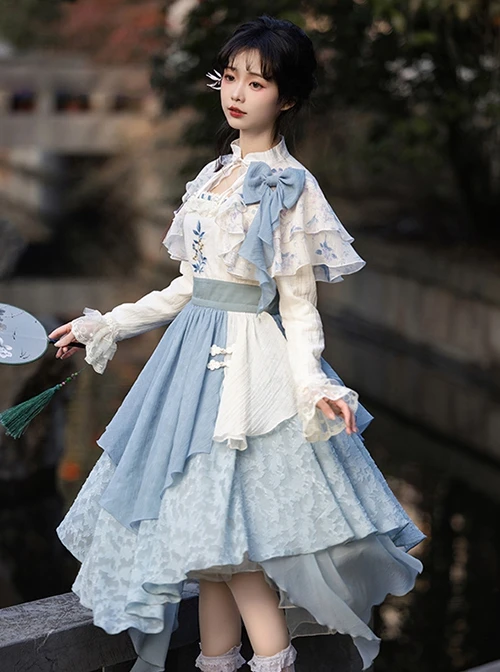 This is a new Chinese-style fake two-piece dress with long-sleeved design, multiple layers of ruffles hanging down from the shoulders, like a small shawl, a tassel value on the chest, and a silver sheen on the chiffon fabric.