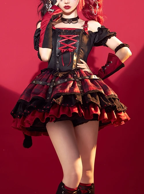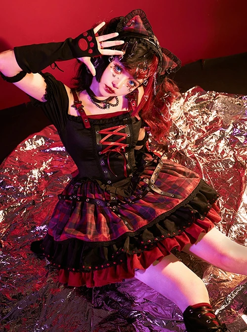 Punk idol style dress, classic black and red contrasting color, retro plaid pattern, leather shoulder straps and strap decoration, cross-strap bow at the chest, sweet and handsome.