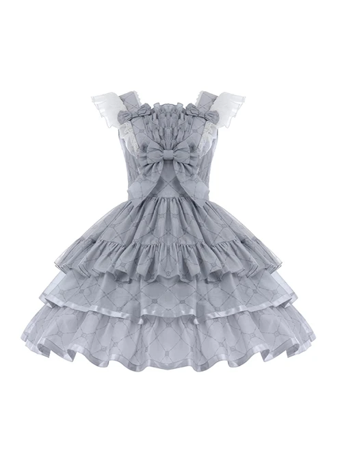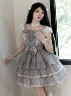 The ballet-style dress is elegant and mysterious in a gray swan-like color. The soft and fluffy skirt has three sections of ruffles, the shoulder straps have elegant lace, and there are multiple layers of ruffles and a bow on the chest.