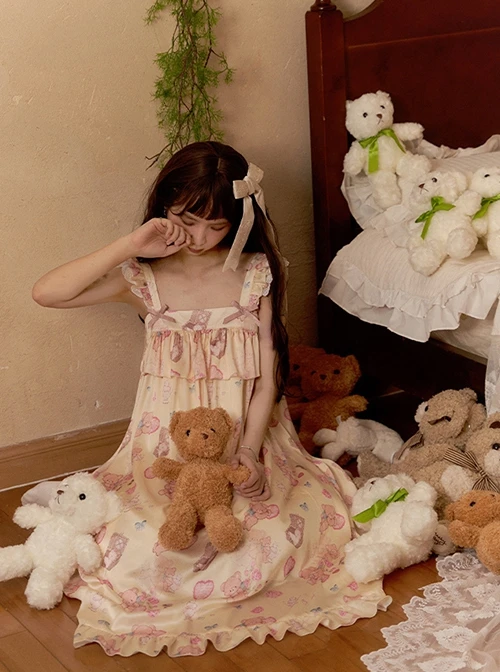 A suspender nightgown with small flying sleeves, an apricot base, and cute light brown bears and light pink hearts printed on them.
