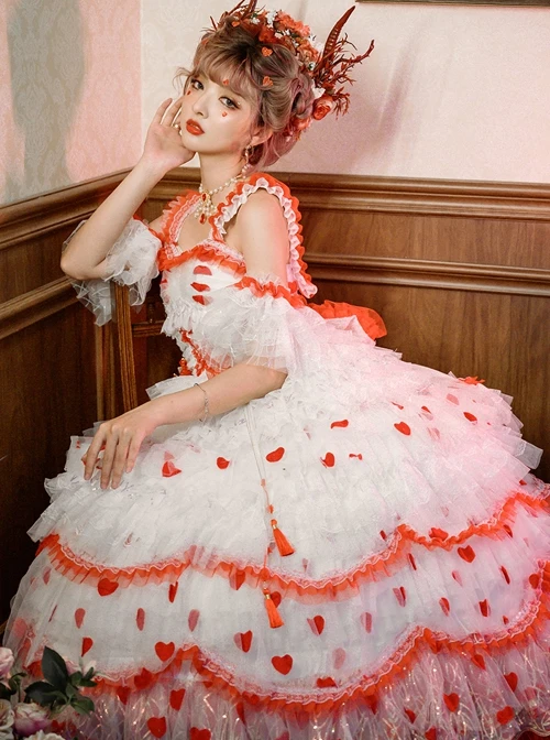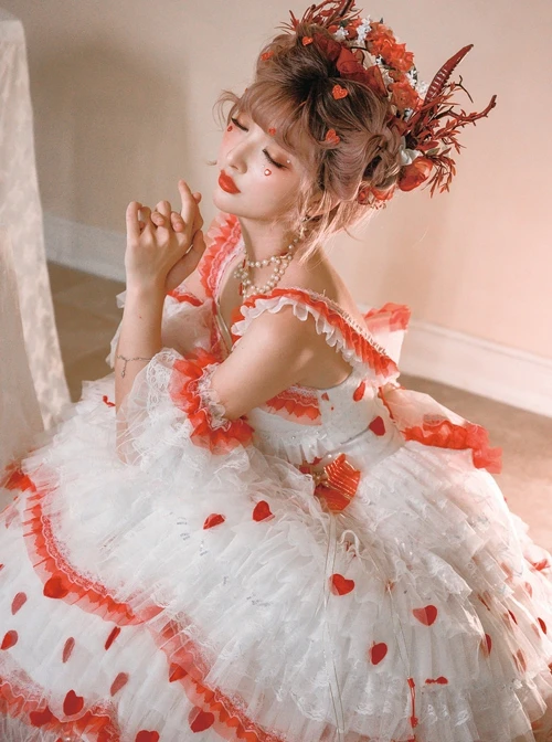 Gorgeous heavy style, rose petal decoration, red and white color scheme, elegant and gorgeous layered skirt, sleeveless classic Lolita dress.
