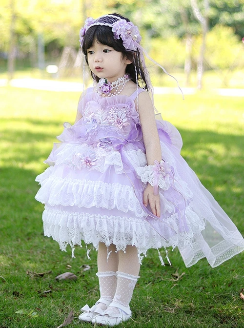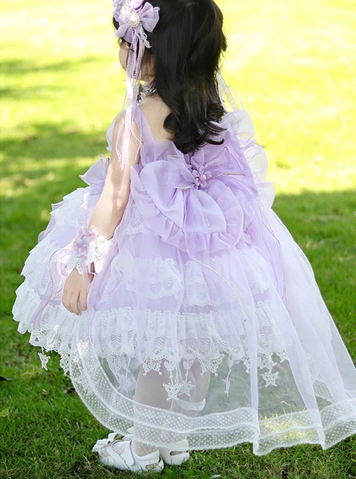 The purple sleeveless dress, purple big bowknot, lace decoration, and butterfly pendant hem design is sweet and lovely