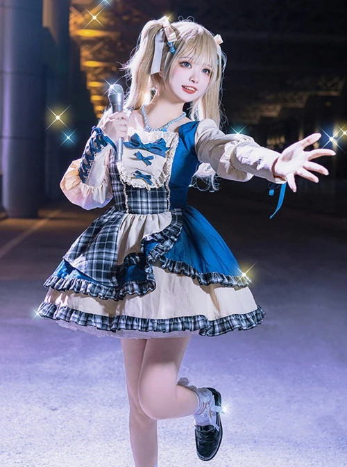 Plaid pure color denim color contrast stitching design, irregular hem long sleeve miniskirt