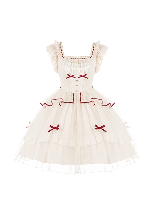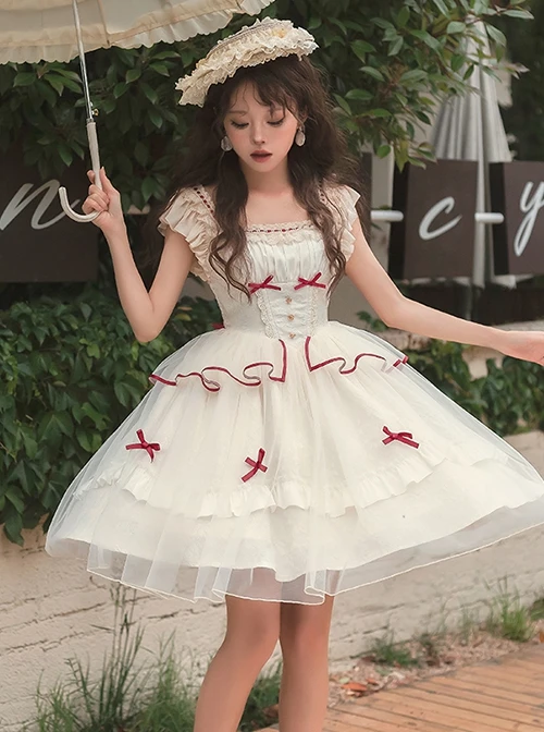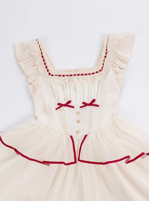 Fly sleeves with a square neckline, lace trim at the neckline, and gathers at the chest. The waist is fishbone support, the waist is narrowed to look thinner, and the bow is decorated. The vegetarian chicken on the back is adjustable. The outer mesh skirt is matched with ruffles, which are romantic and flexible.
