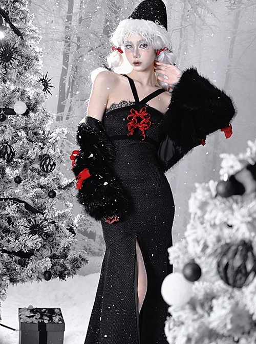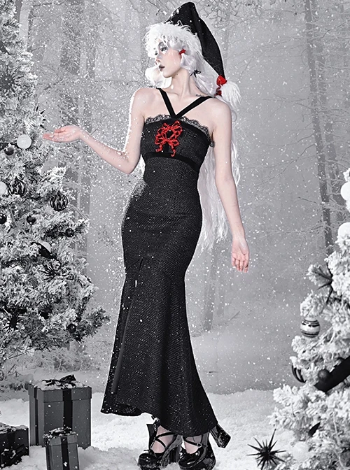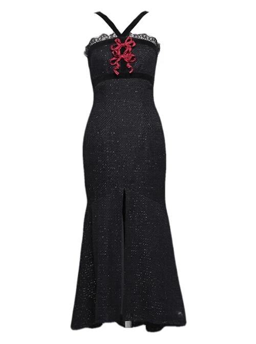Crossover velvet straps frame the neck, lace panels at the chest, elasticated back, slit skirt to frame the legs, detachable bowknot, slim fit